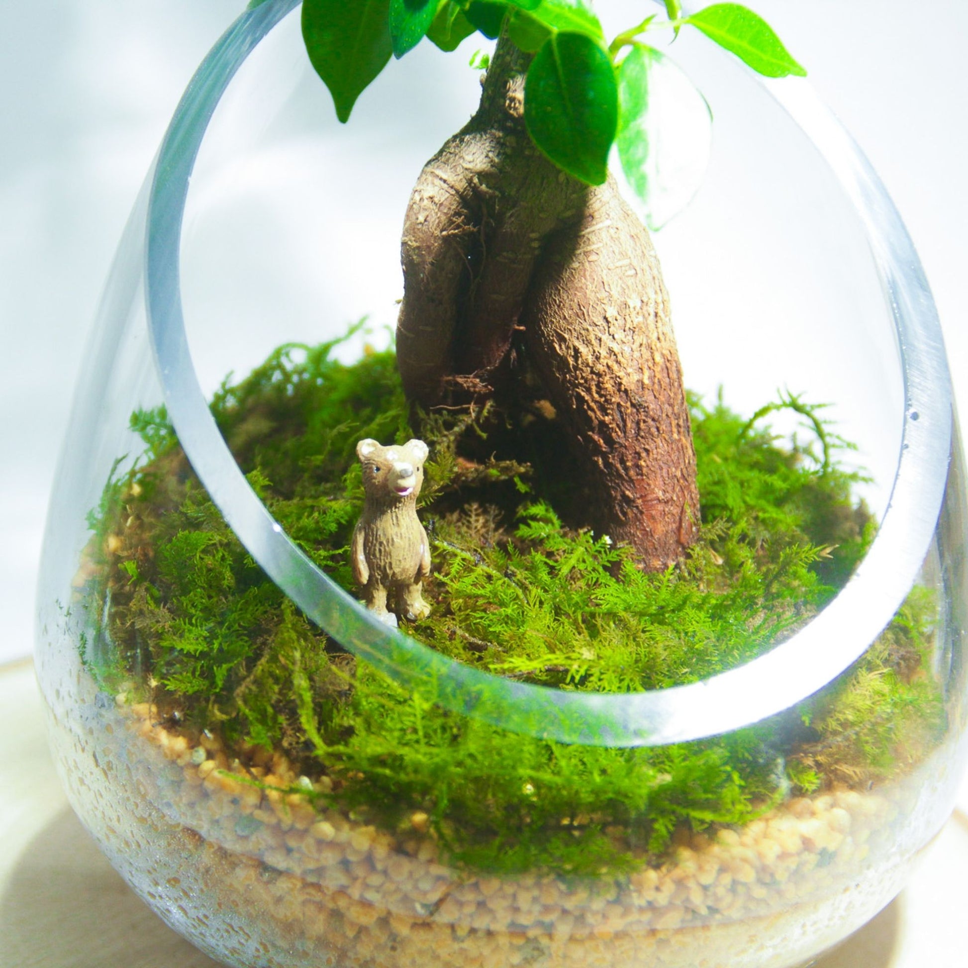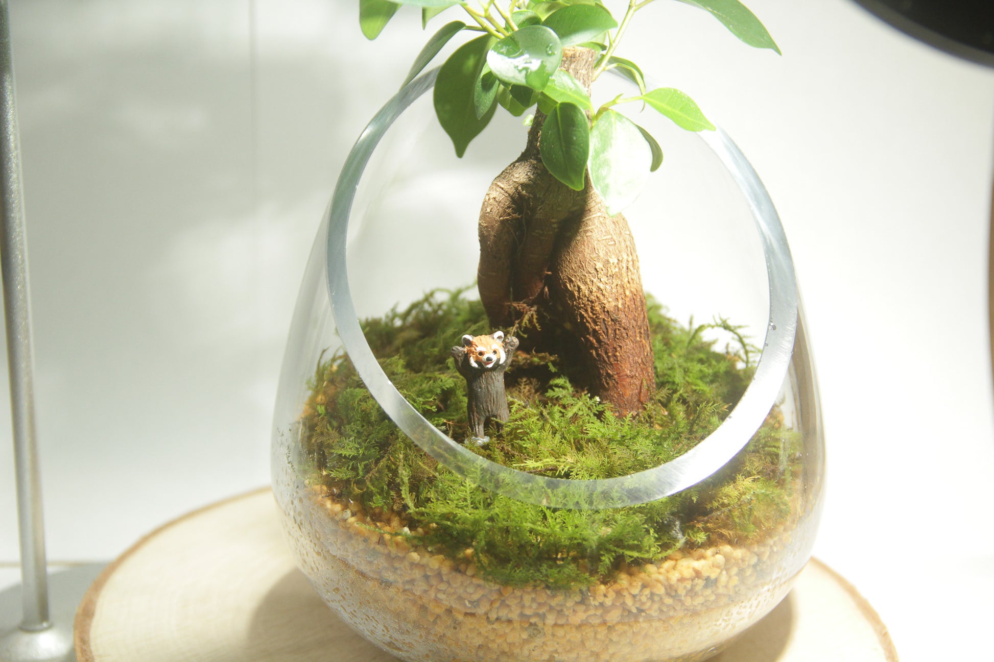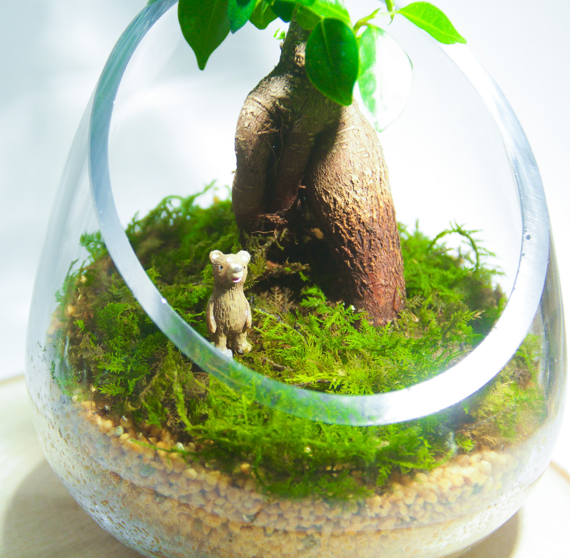 ガジュマルは多湿環境を好み、生命力が強いため、フタのない苔テラリウムとの相性が非常に◎