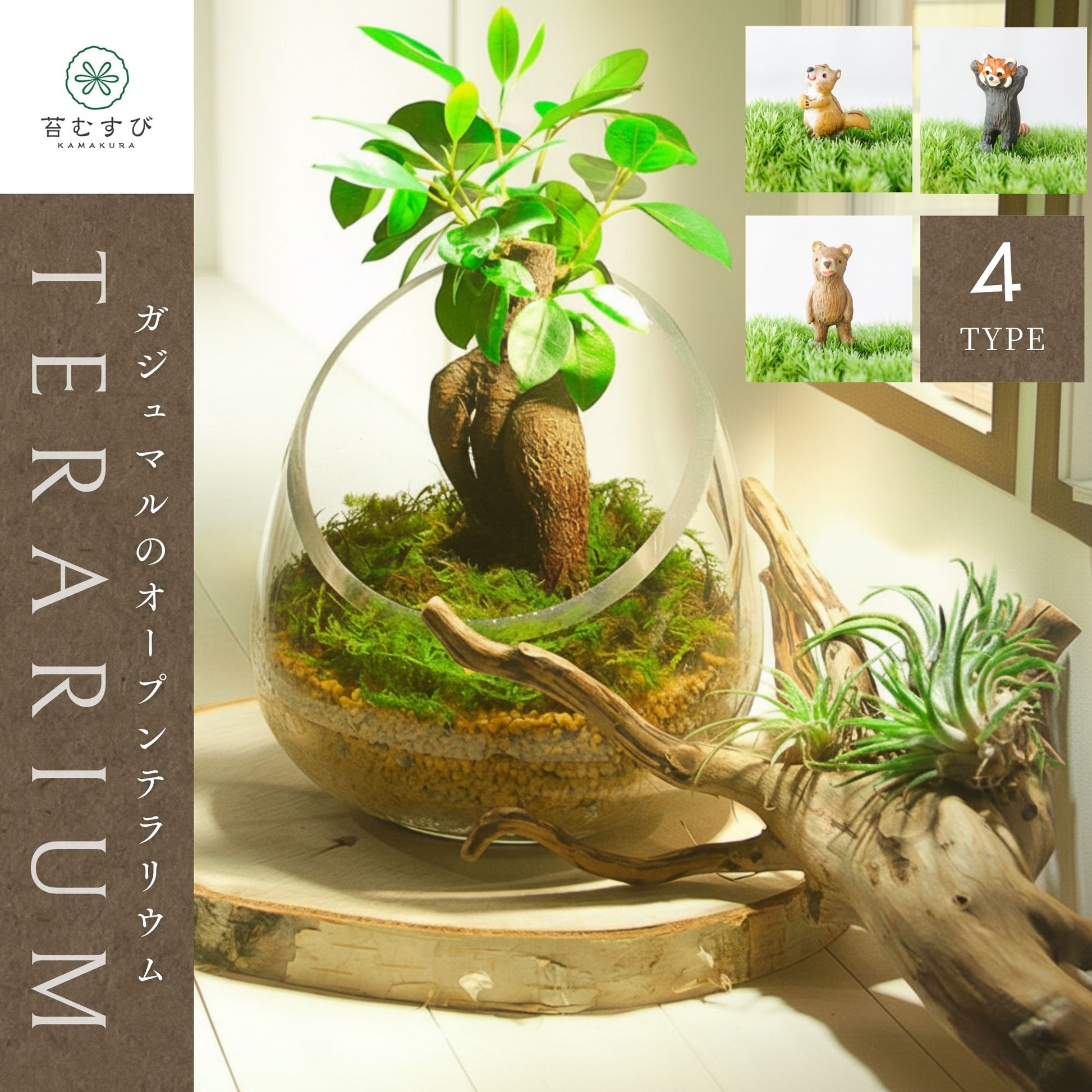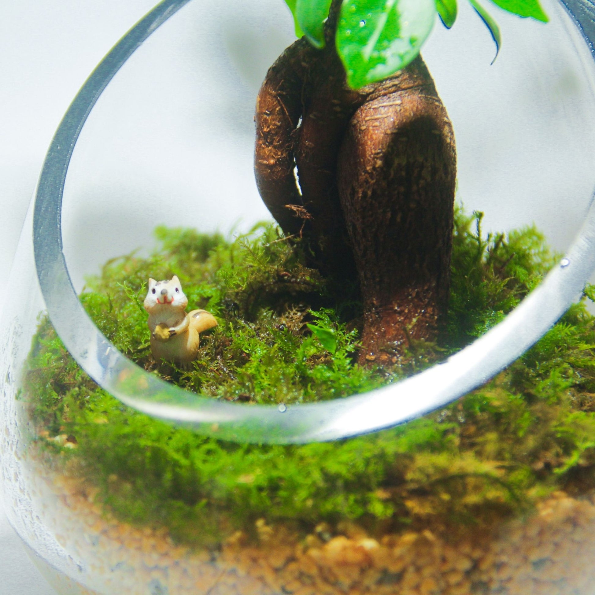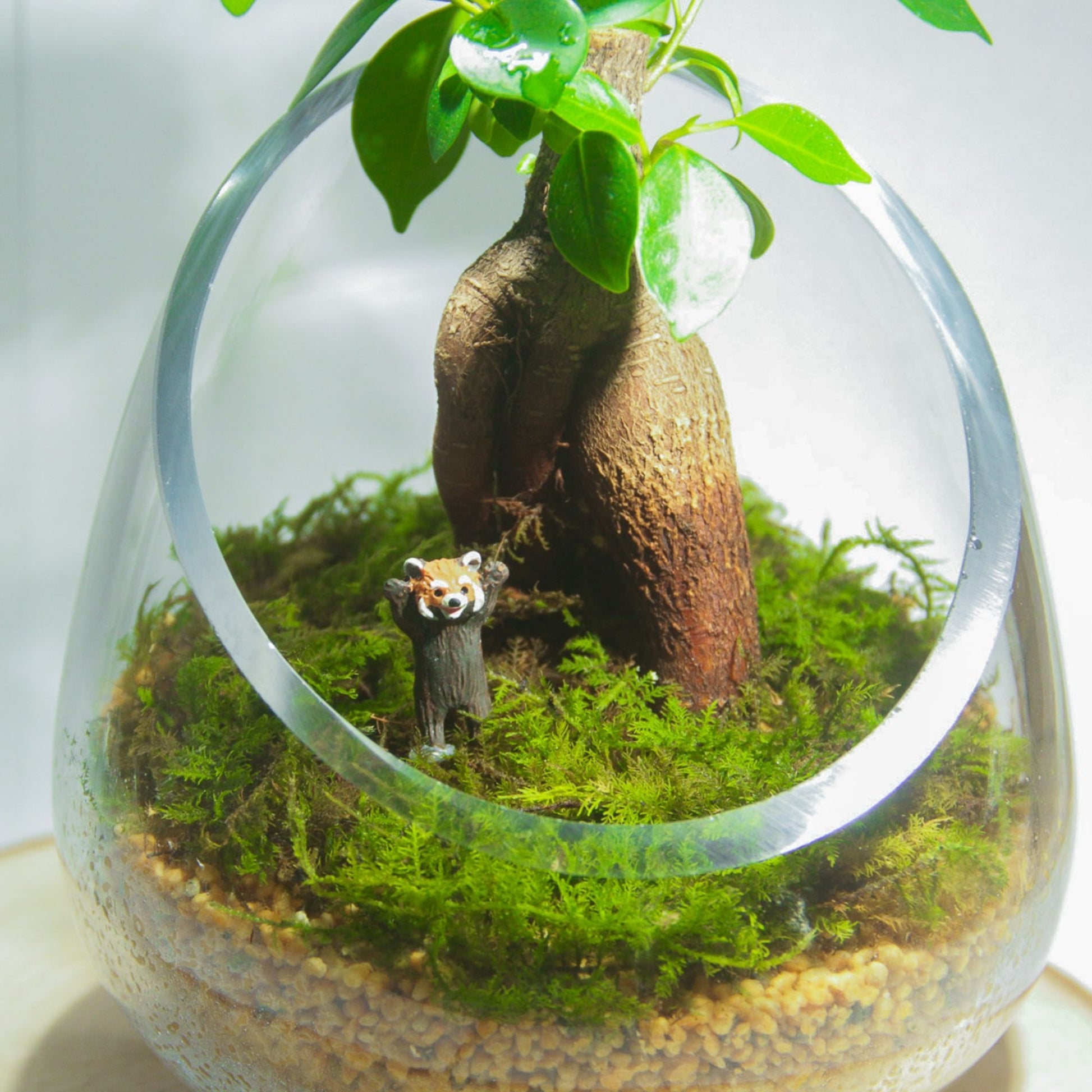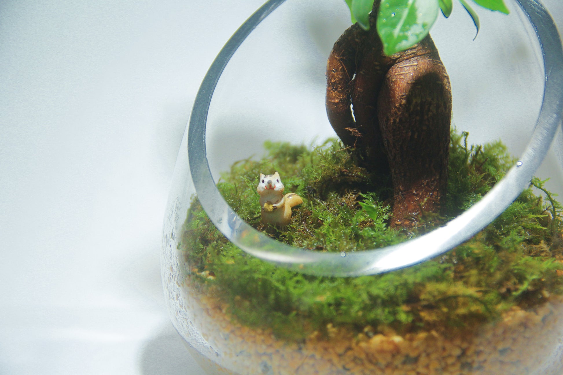 ガジュマルは多湿環境を好み、生命力が強いため、フタのない苔テラリウムとの相性が非常に◎